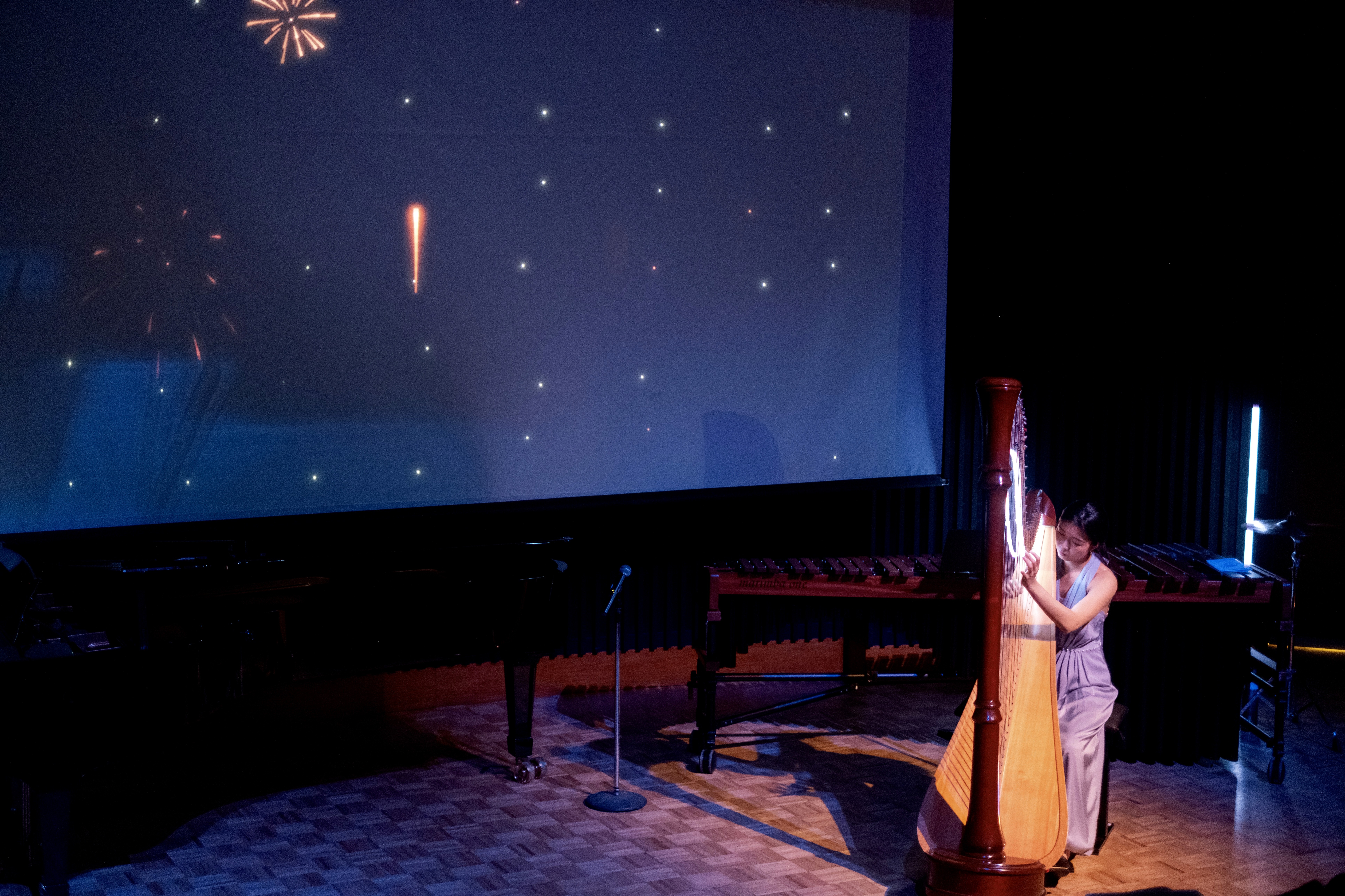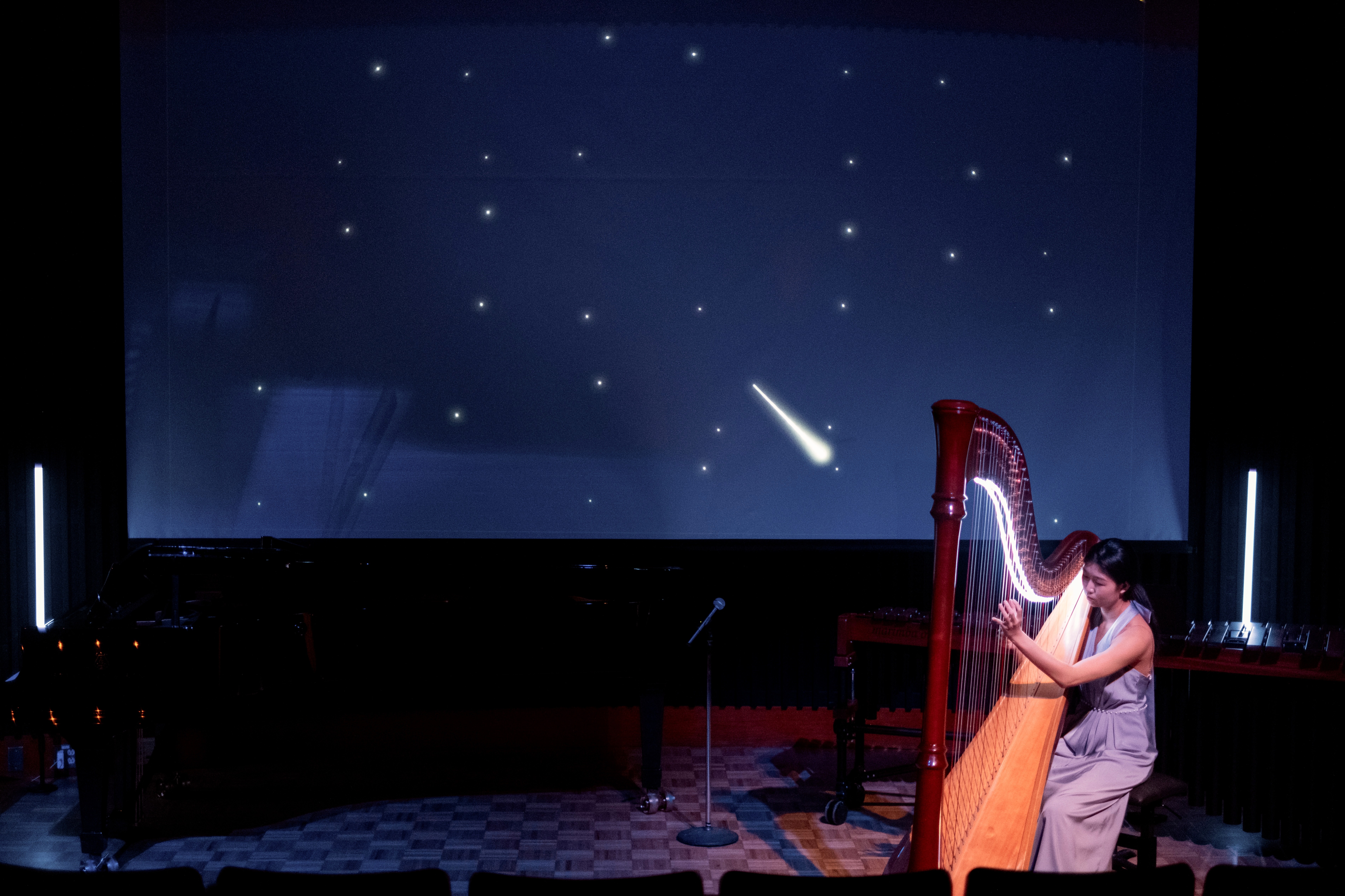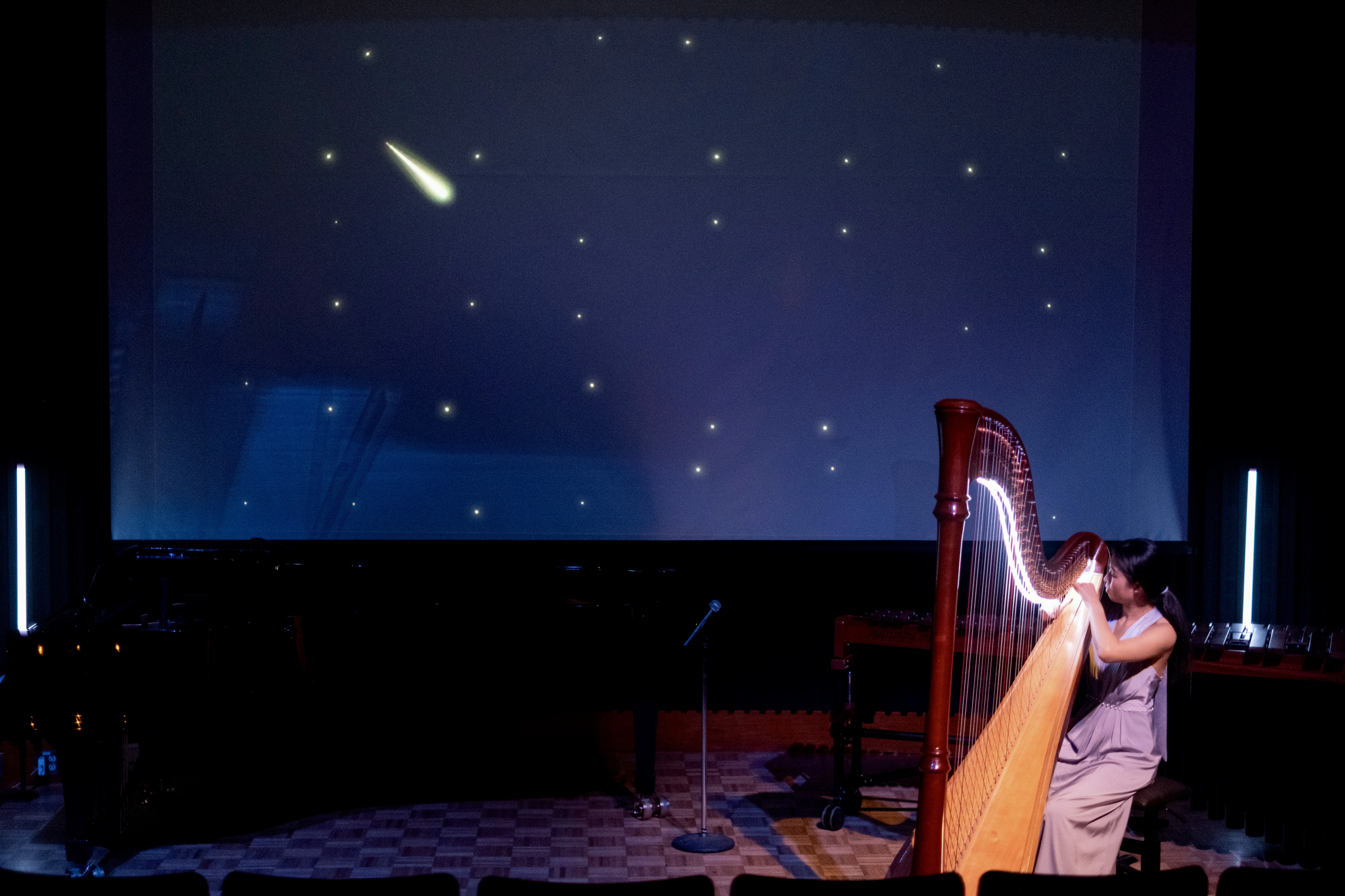 This piece is made from that feeling. Not just of watching, but of participating. The audience becomes part of the composition—through an audiovisual sequencer that responds to touch and presence. Sounds spark. Lights flicker. The harp improvises, weaving through it all like the trace of a comet across the sky.