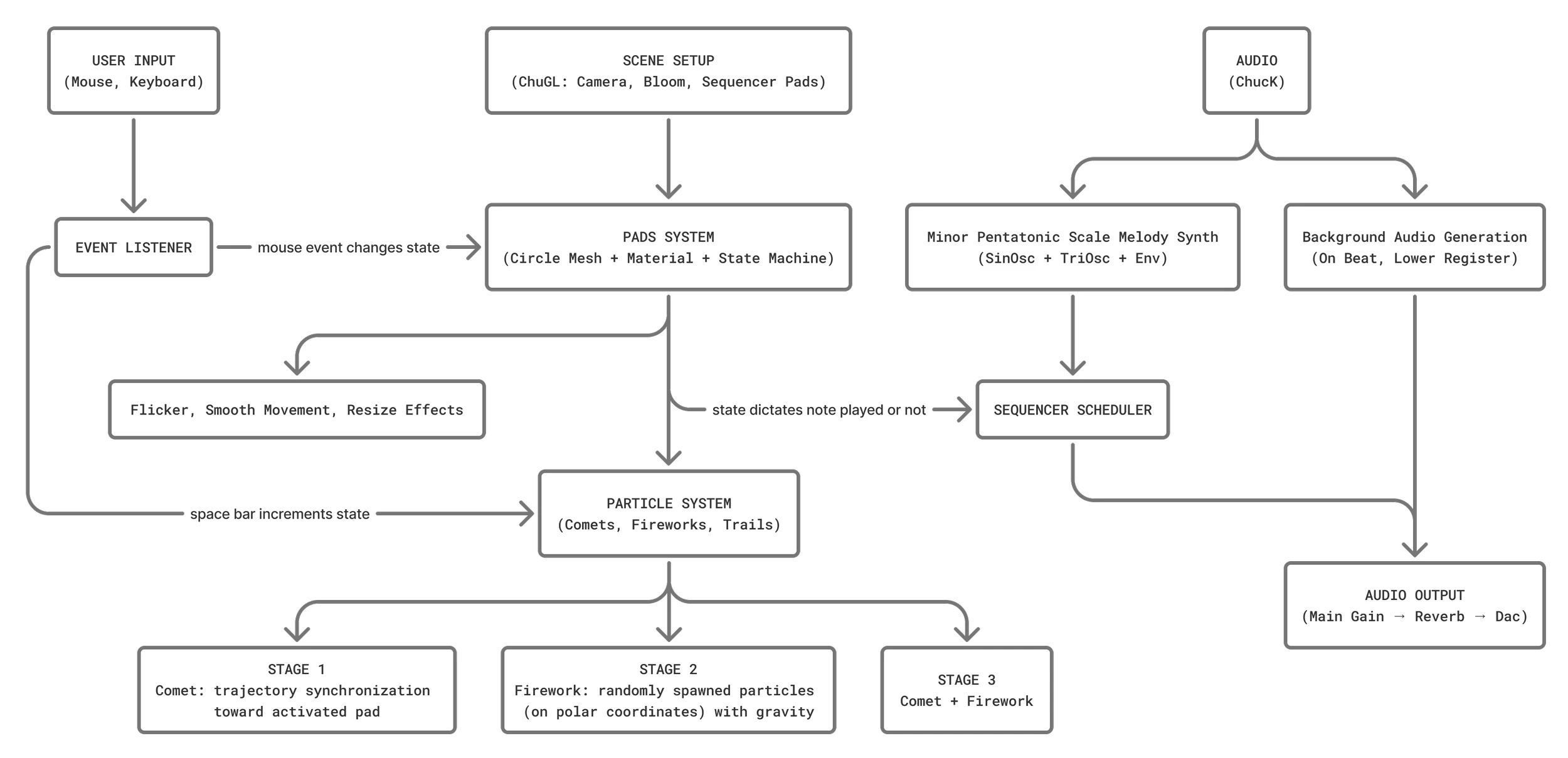 A live improvisatory performance with an interactive sequencer inspired by the fleeting burst and disappearance of fireworks, where light and sound ignite in sudden flashes that respond to presence before dissolving like sparks in the night.
