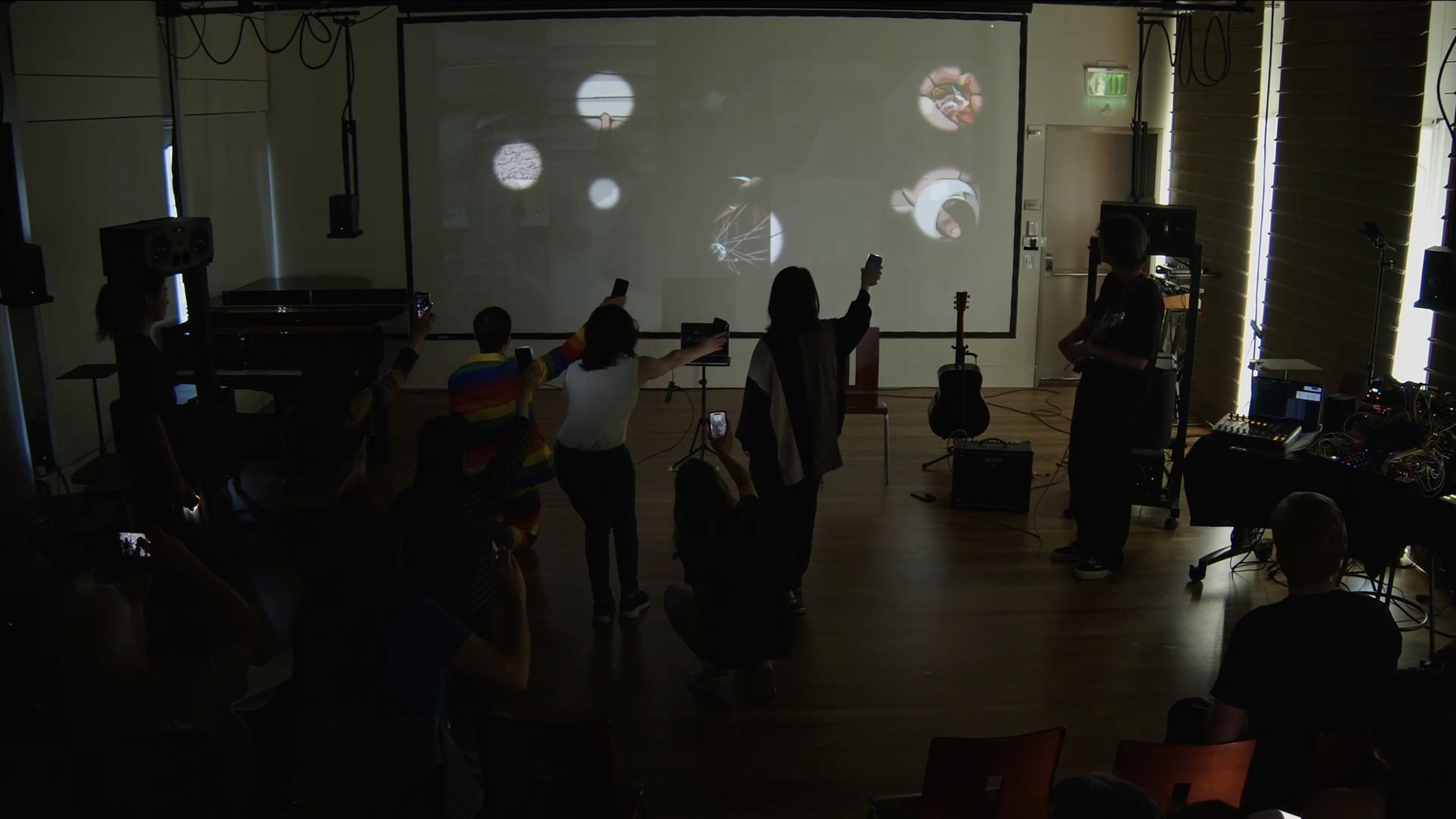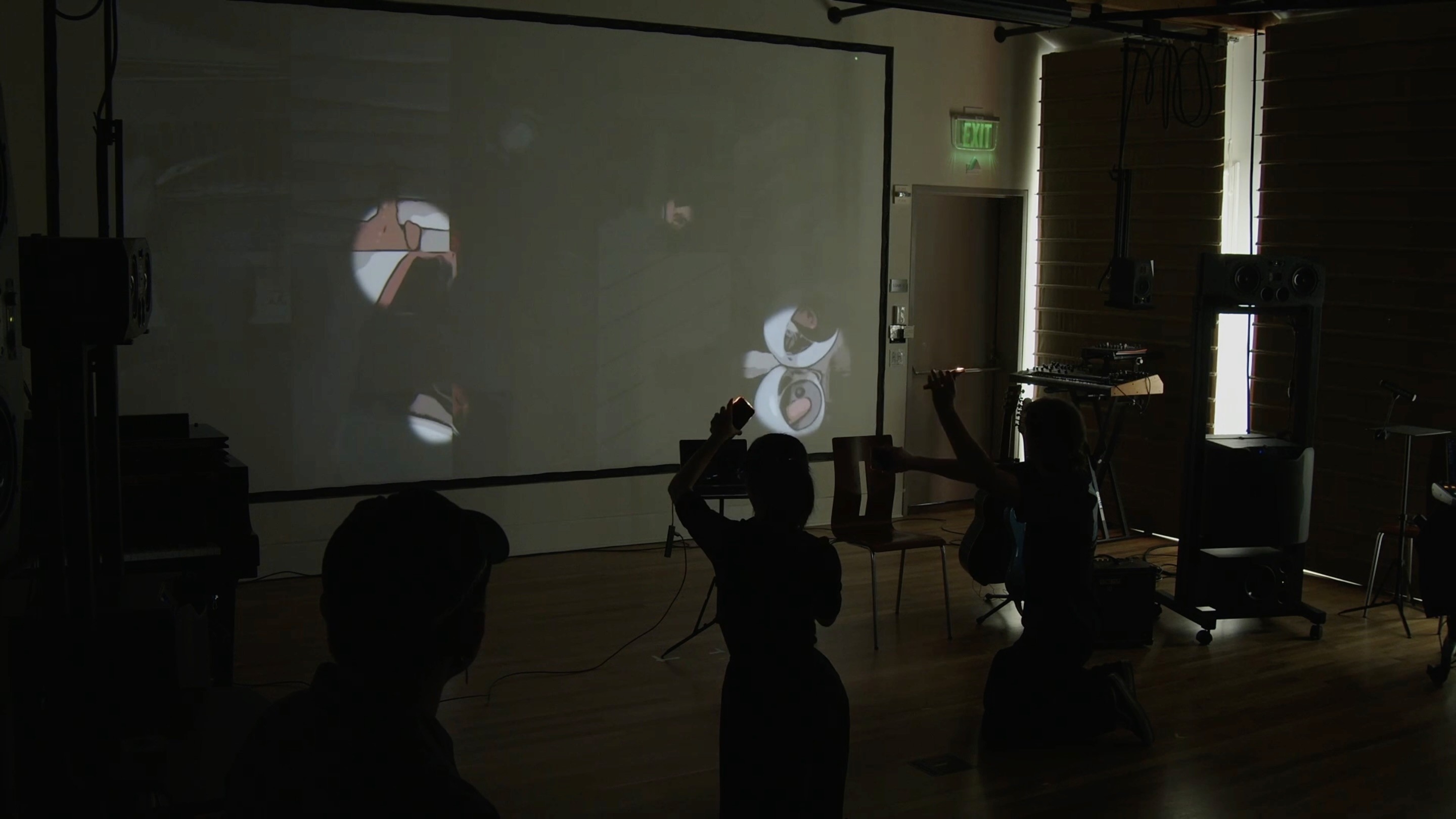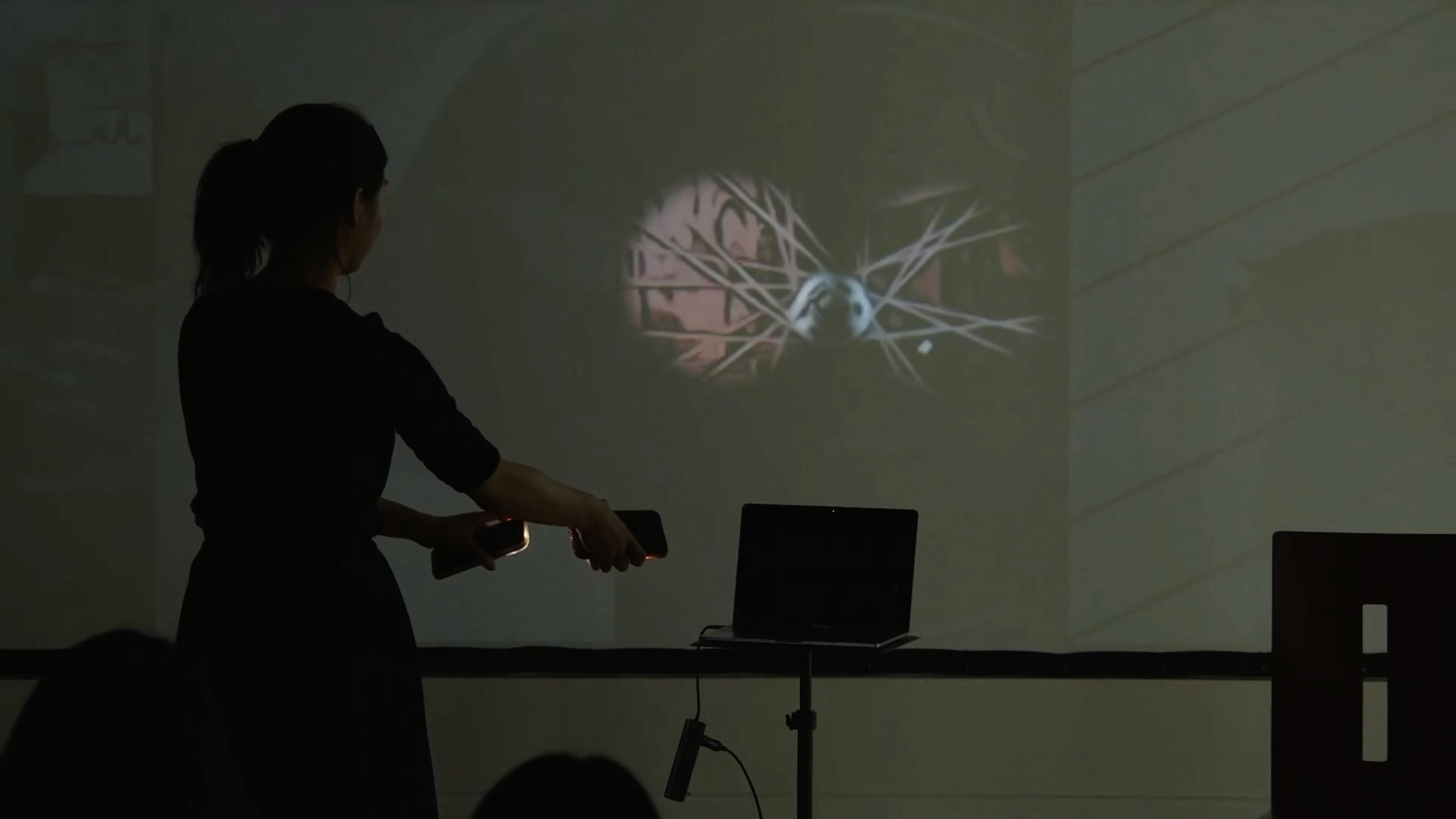 The system sees. It responds. A gesture here brings forth a tone. A flicker there ripples across the projection. Even the softest movement carries weight—transforming space, transforming sound.
