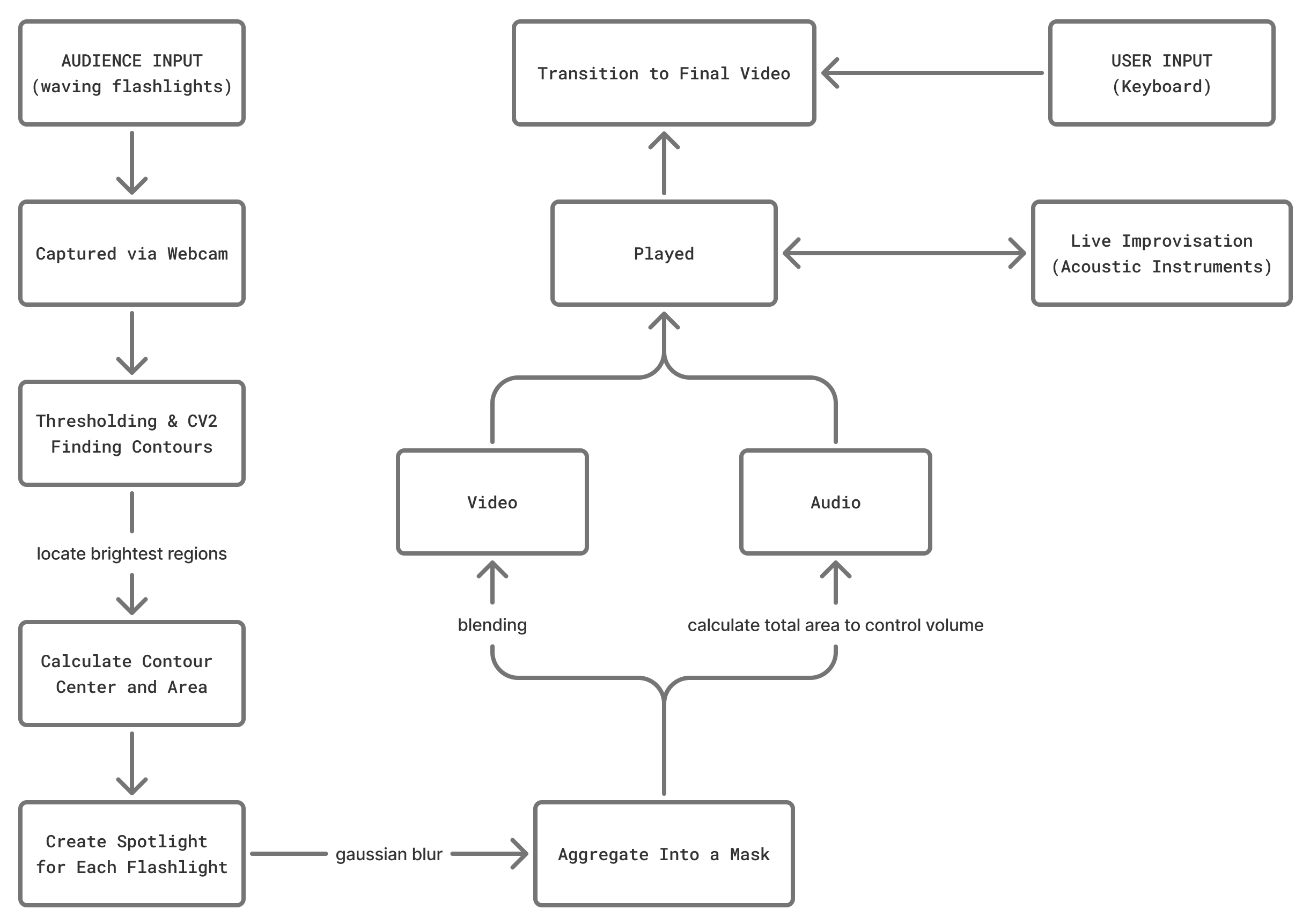 An interactive performance-installation in which audience-generated light activates and shapes live music and real-time visuals, transforming beams of light into a shared, evolving soundscape.